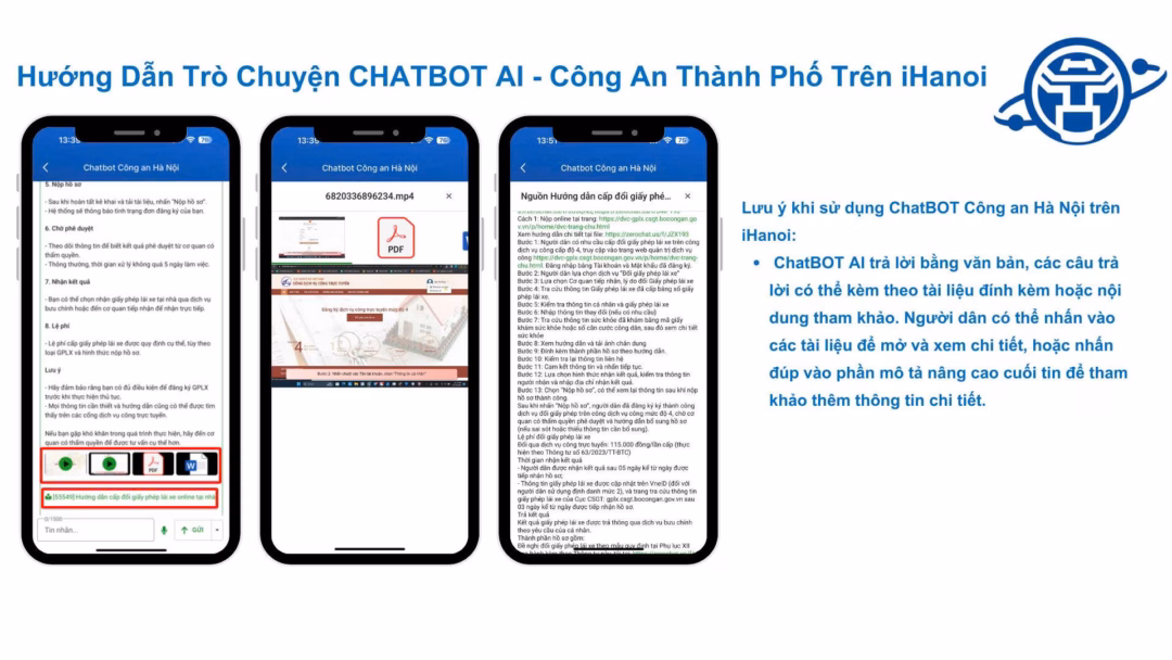 Trợ lý ảo Chatbot AI được thiết kế để hỗ trợ công dân trong việc hỏi đáp thông tin về các thủ tục hành chính của công an. Các thông tin mà Chatbot hỗ trợ bao gồm đăng ký cư trú, cấp chứng minh nhân dân, cấp giấy phép lái xe và nhiều thủ tục khác. Ngoài ra, Chatbot cũng cung cấp kiến thức tuyên truyền quan trọng về phòng cháy chữa cháy (PCCC), an ninh trật tự, giao thông và phòng chống lừa đảo công nghệ cao. Người dân có thể trò chuyện trực tiếp với Chatbot thông qua ứng dụng iHanoi để được hỗ trợ.